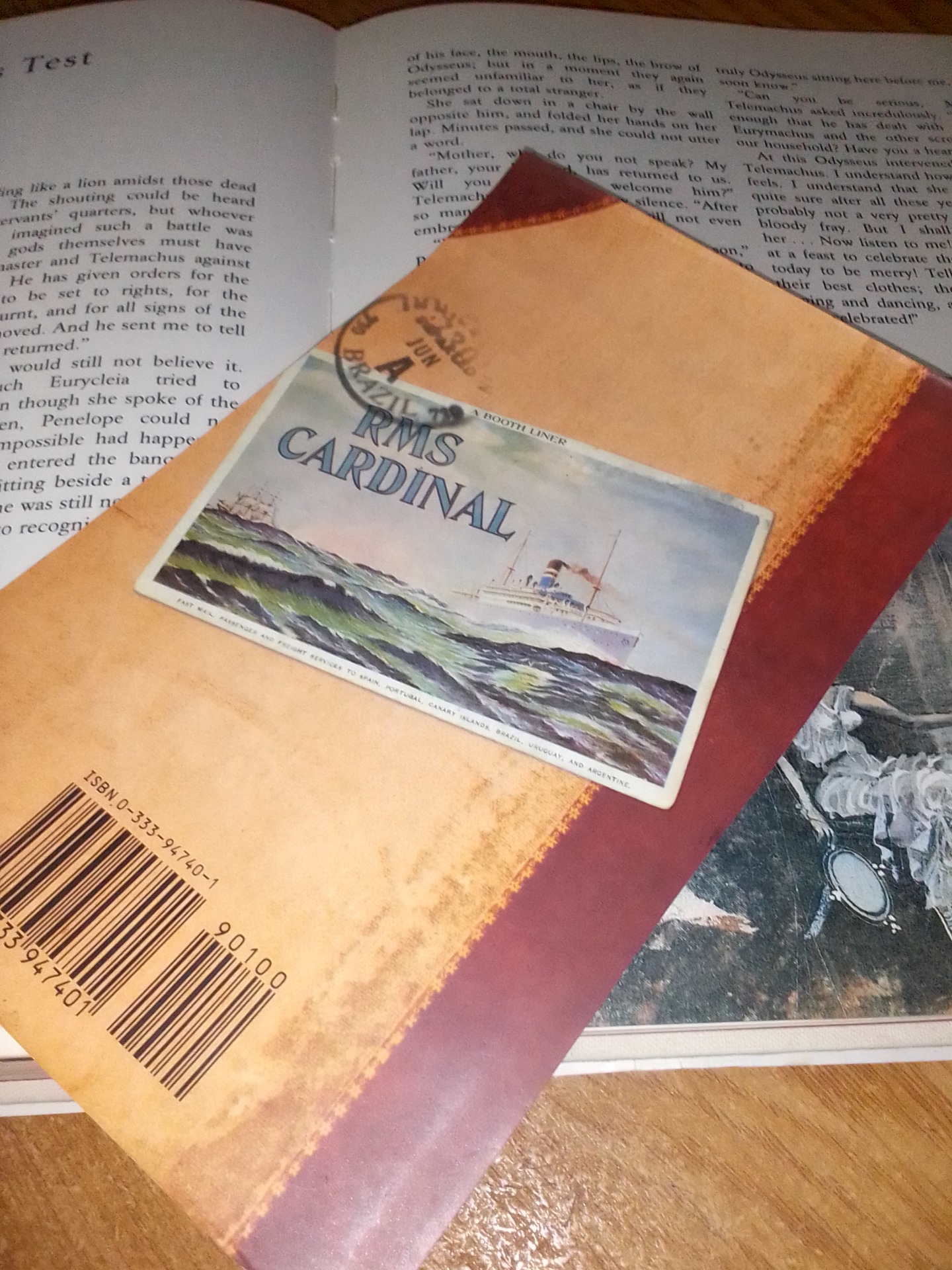 The re-telling of The Odyssey by Jaroslav Hulak, the book I reference in my blog post of the same name, and eventually went on to complete. It is a novel-like version of the story, which I'd recommend to anyone. My arty bookmark is courtesy of an historical novel I donated to a hospice shop, while retaining its dust jacket.